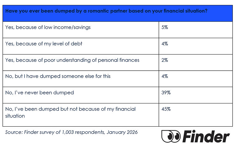Finder’s research shows 5% of Australians were dumped for having a low income/savings, 4% due to their level of debt, and 2% because of their poor understanding of personal finances. A further 4% of Aussies said they have been the one to let a romantic partner go.